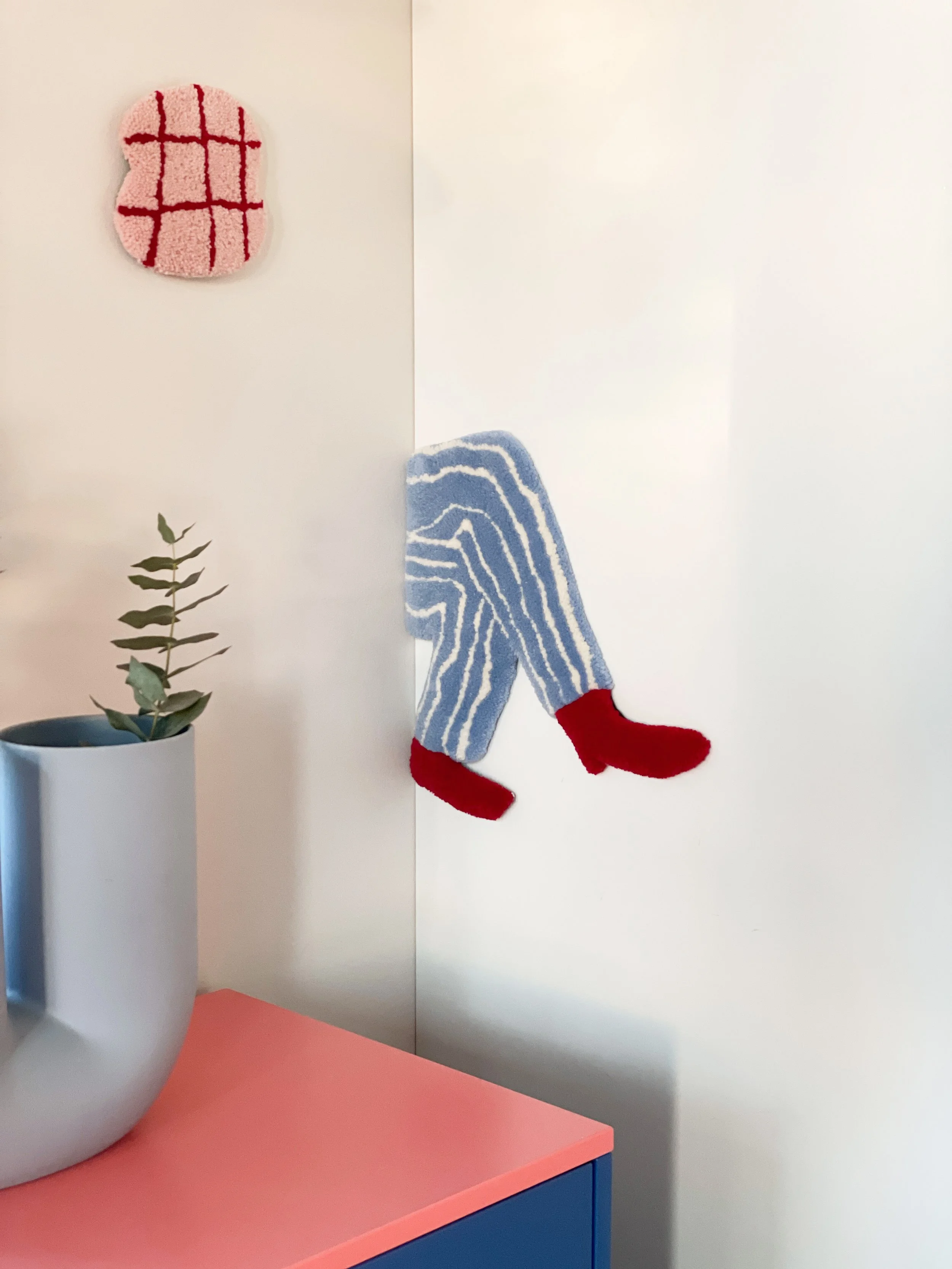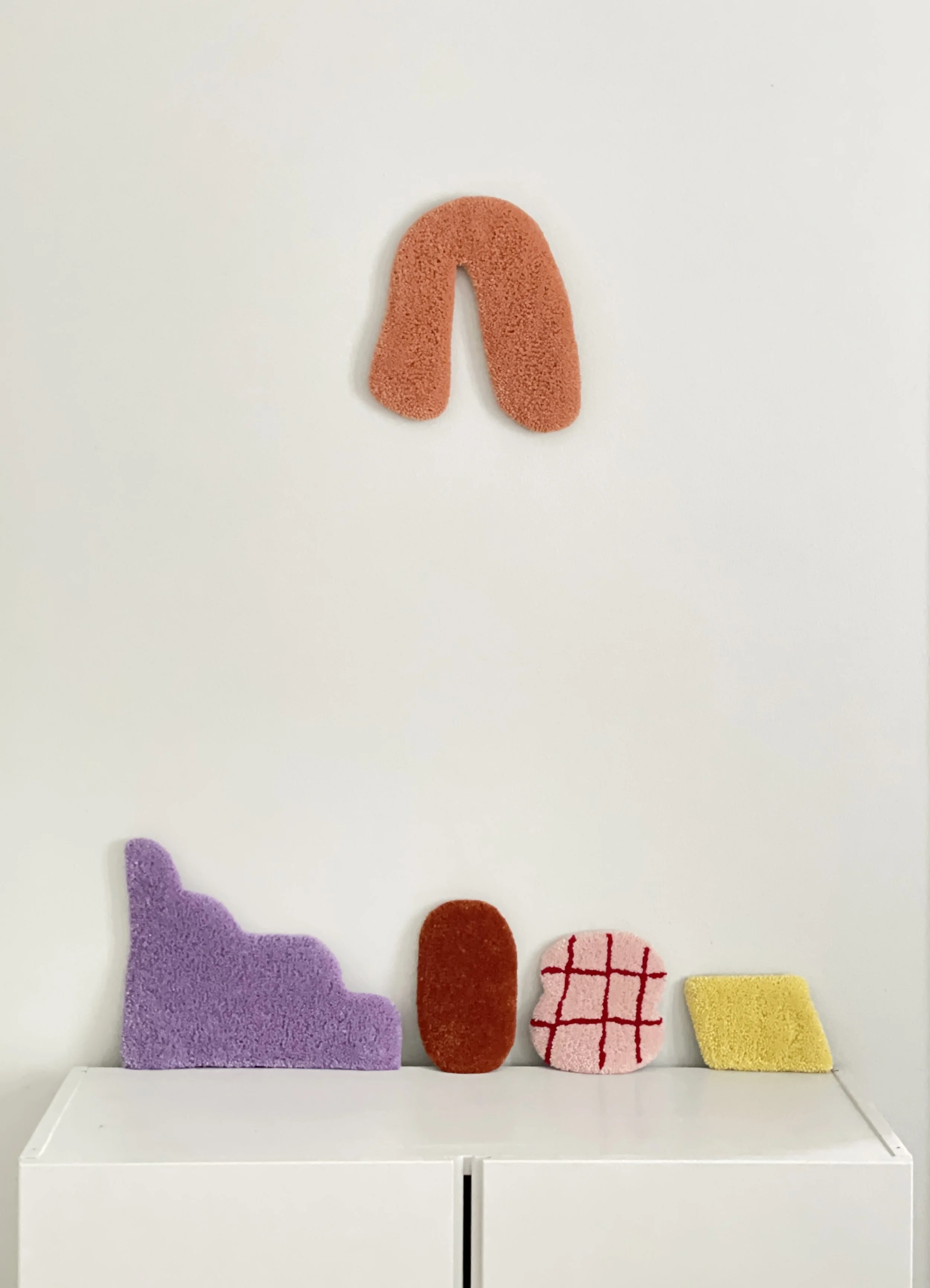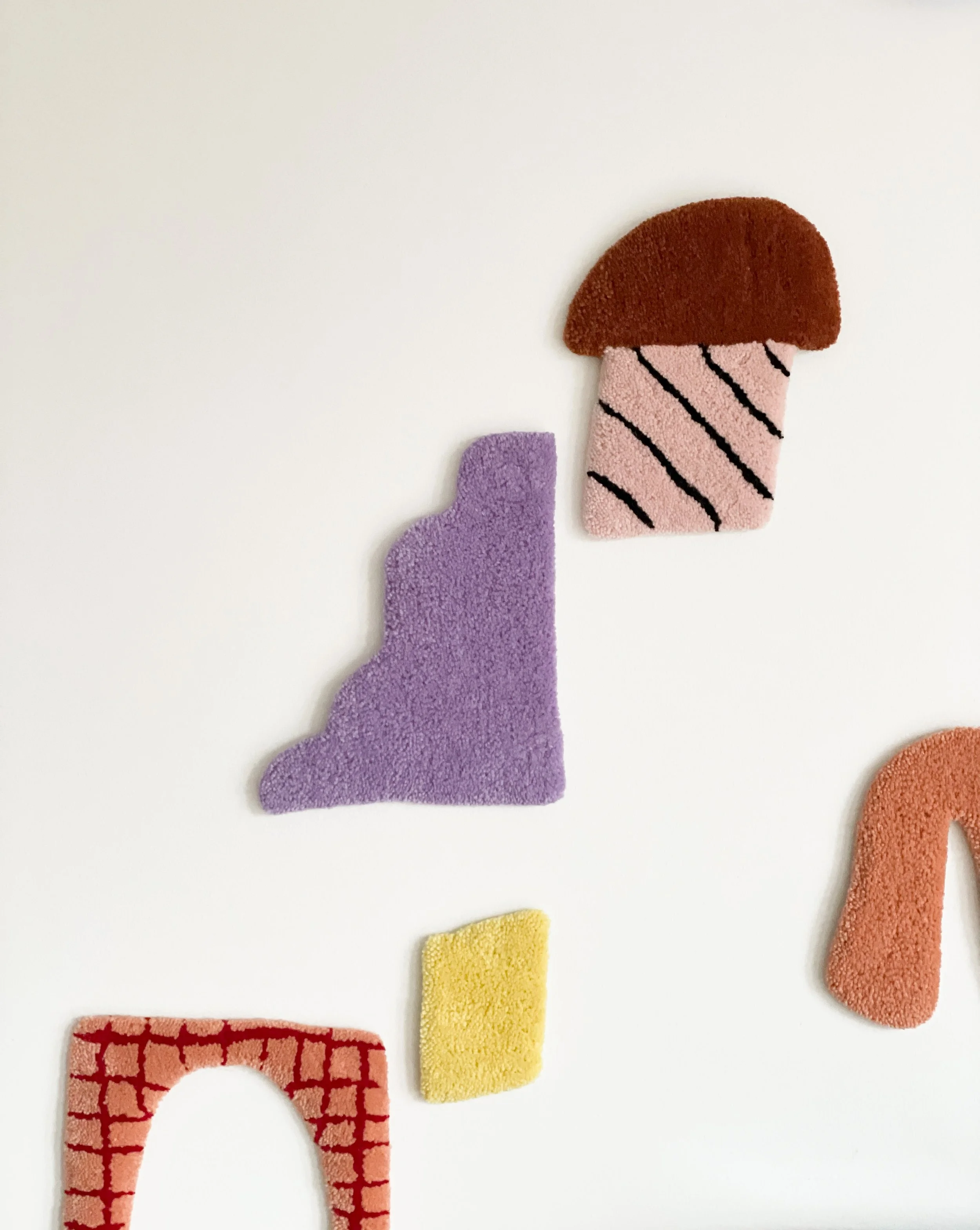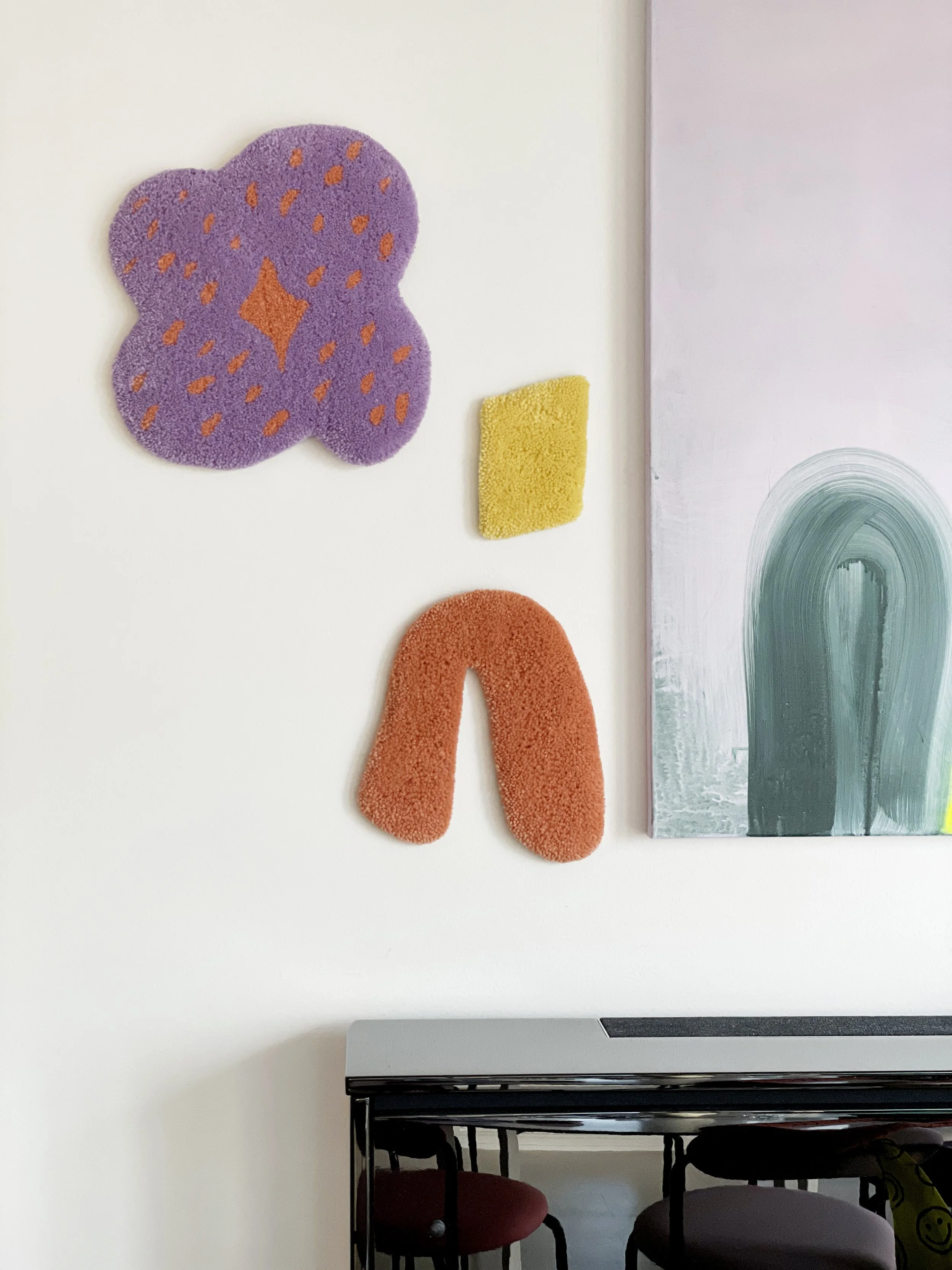 Koko oma kollaasisi Pilkkeistä! Villalangasta tuftatut palaset voi ripustaa seinälle yksittäin tai rykelminä. Teoksen takana on useampi ripustuskoukku eri puolilla teosta, joka se mahdollistaa vaihtelevan ripustuksen. Ilmoita tilauksen yhteydessä teosnumero/teosnumerot!